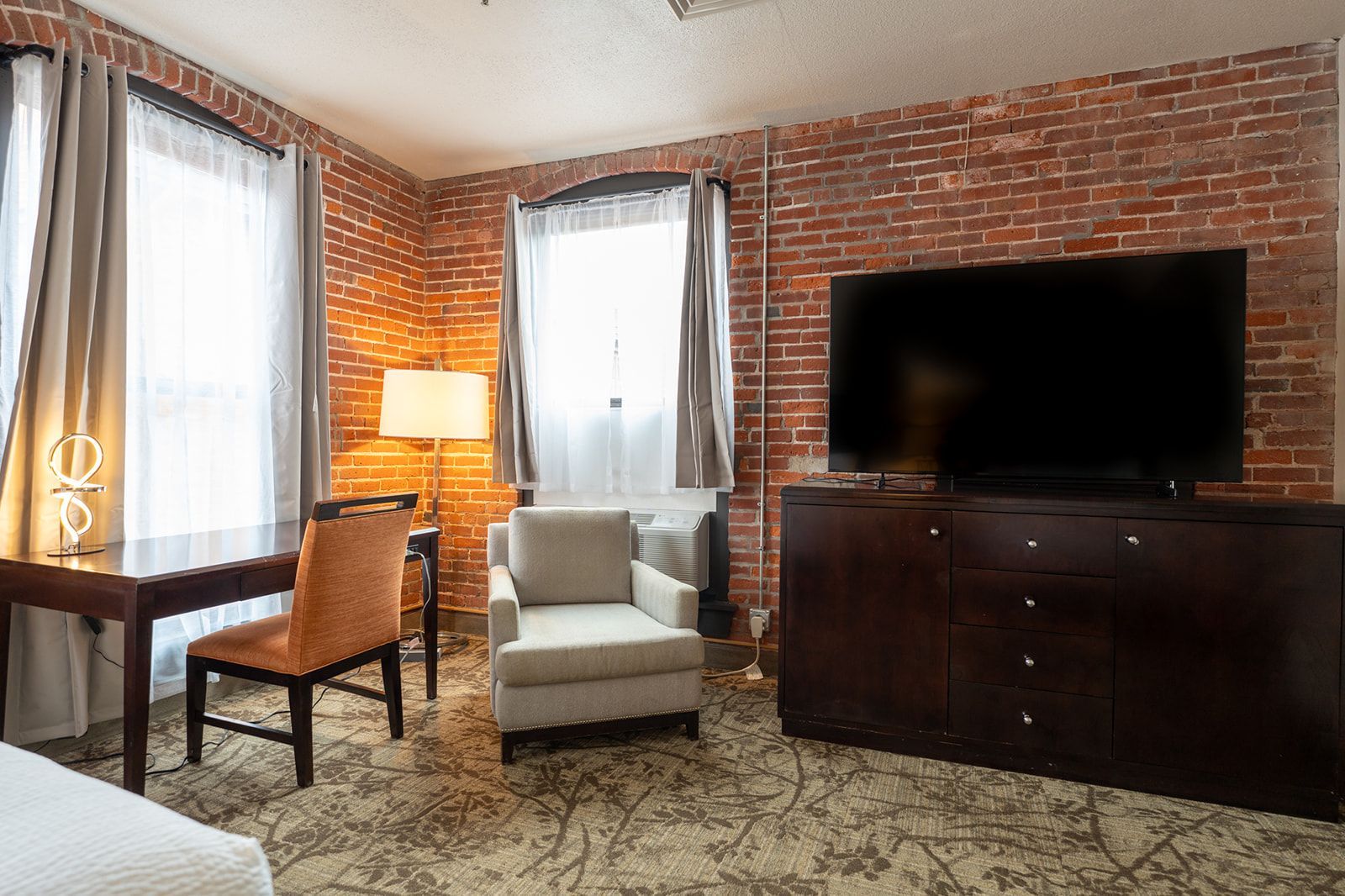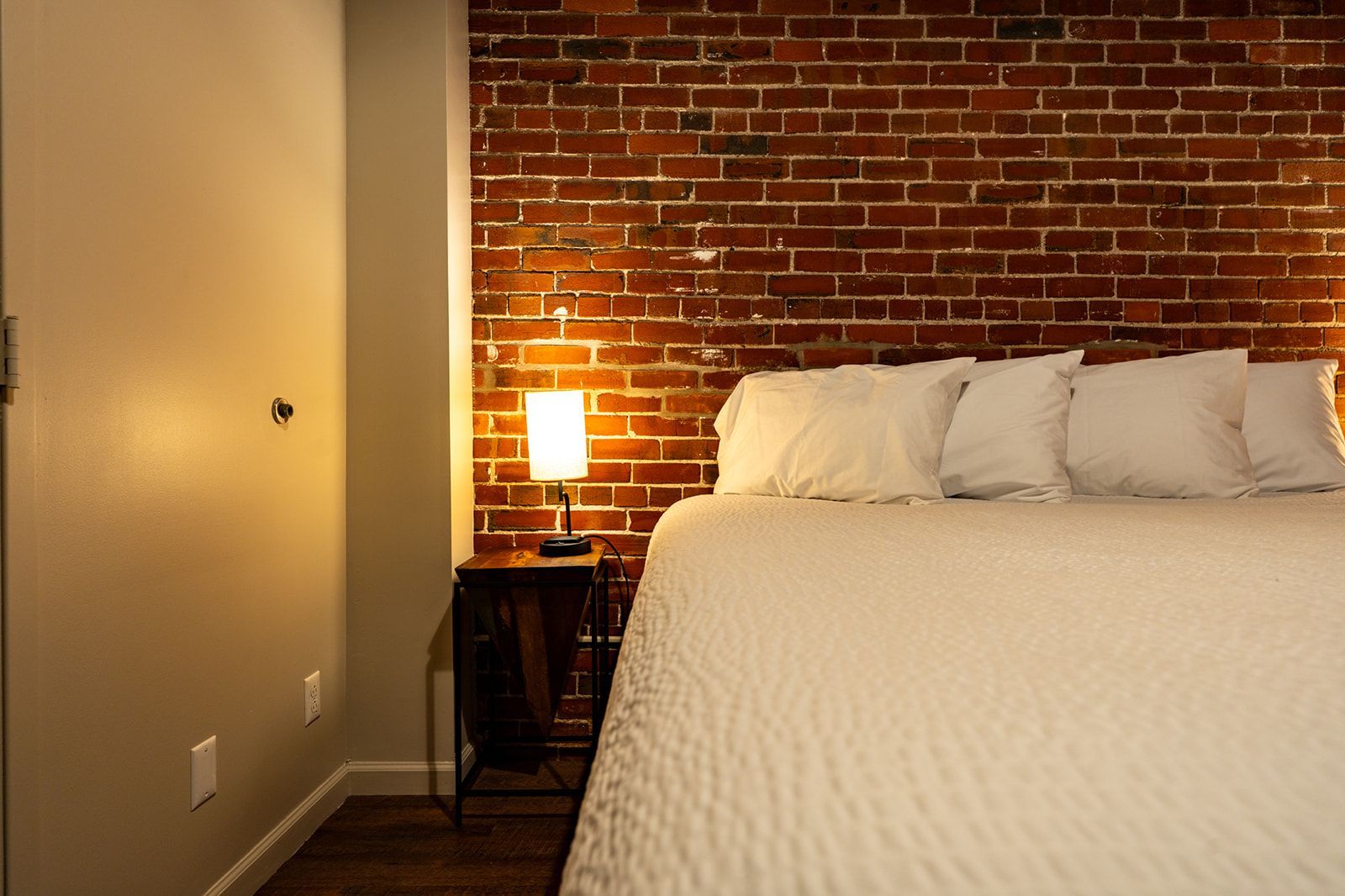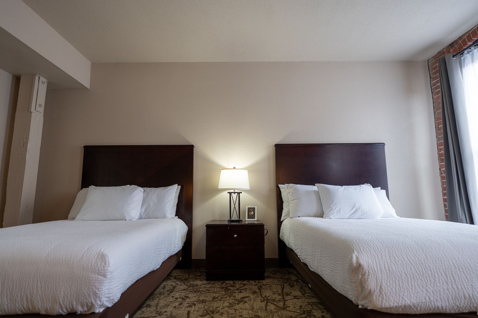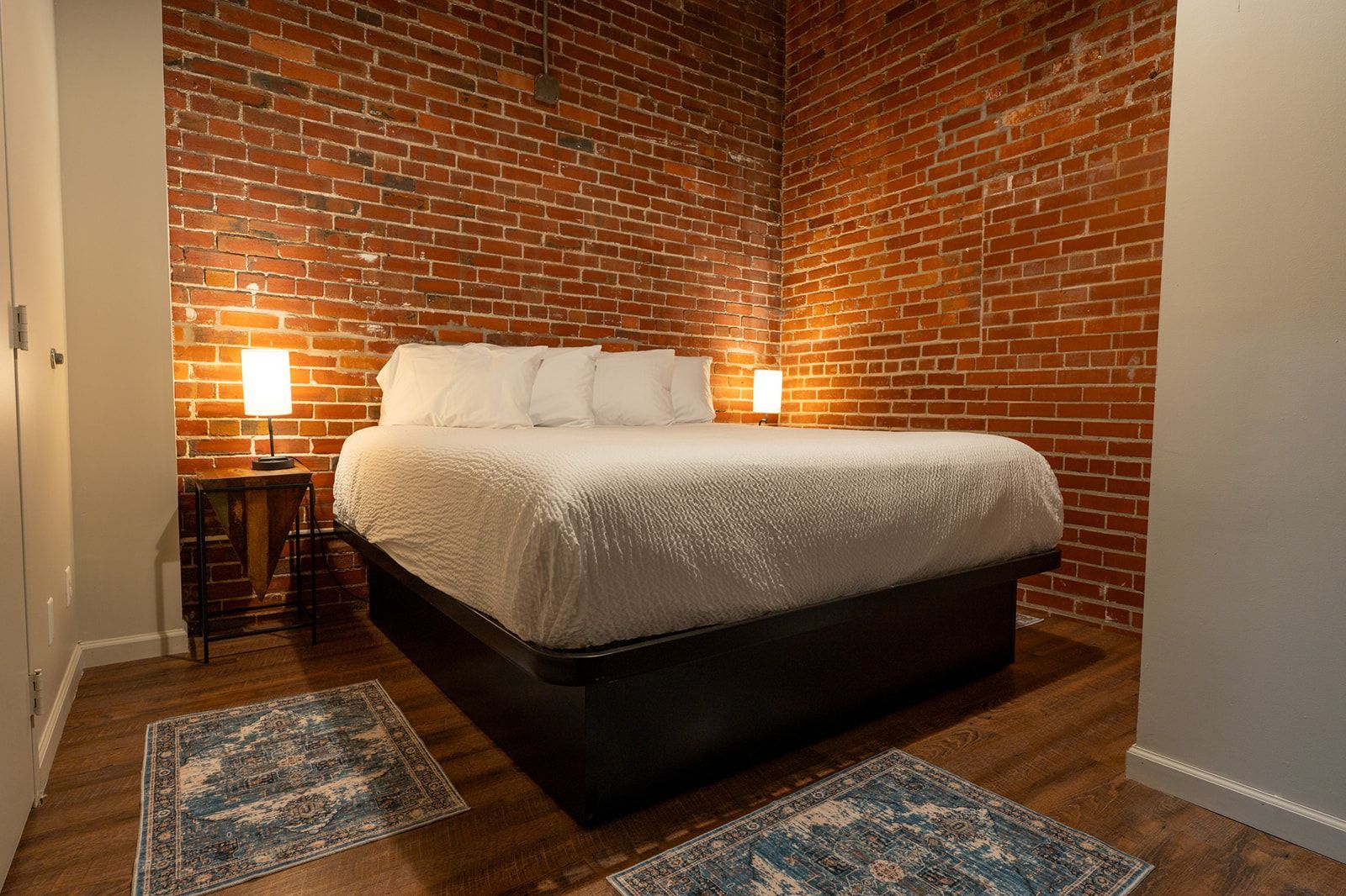 Perfect for families, small groups, or extended stays, our Two-Bedroom Suite features a king bedroom, a queen bedroom, full bathroom, and fully equipped kitchen. Exposed brick, tall ceilings, and large windows create a warm industrial feel, while modern furnishings make it feel like home. Enjoy free Wi-Fi, smart TV, and a spacious living area ideal for relaxing, working, or gathering—all in the heart of downtown Erie.