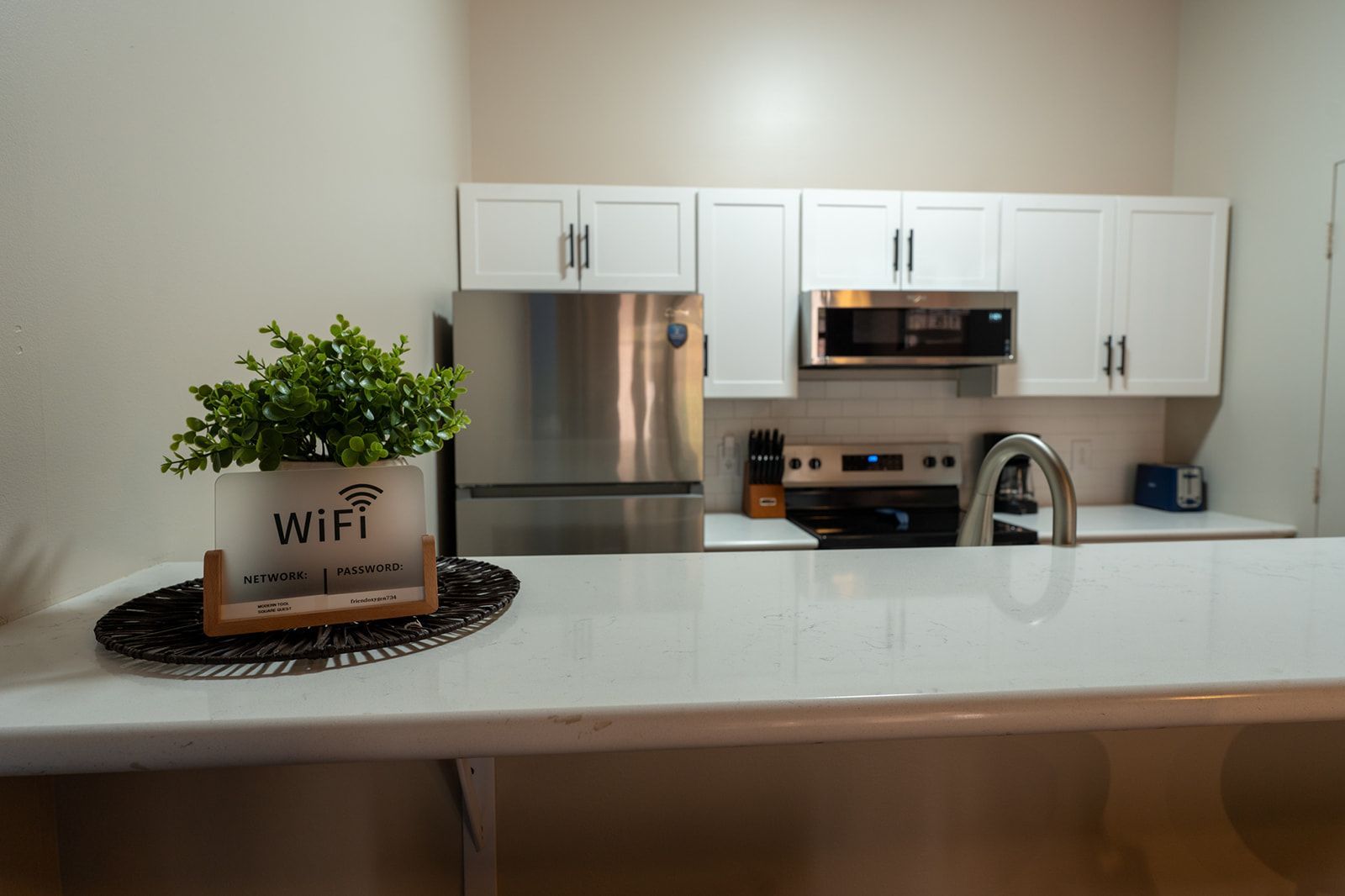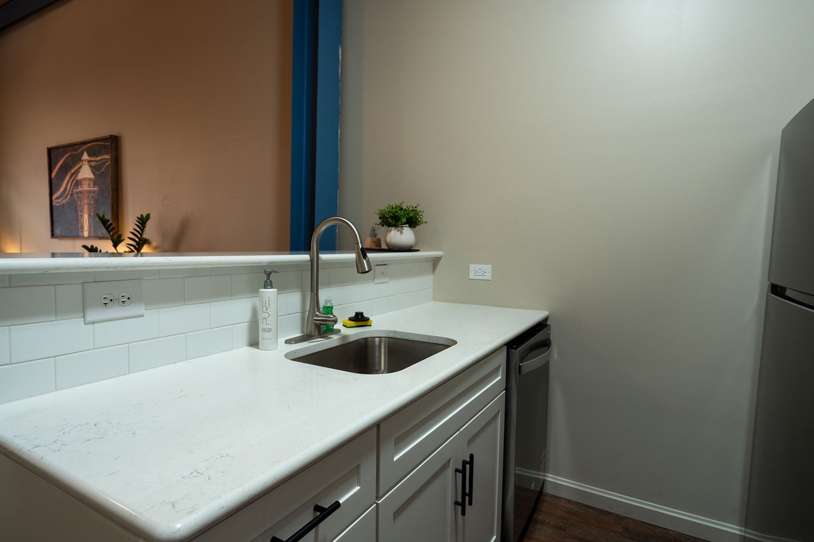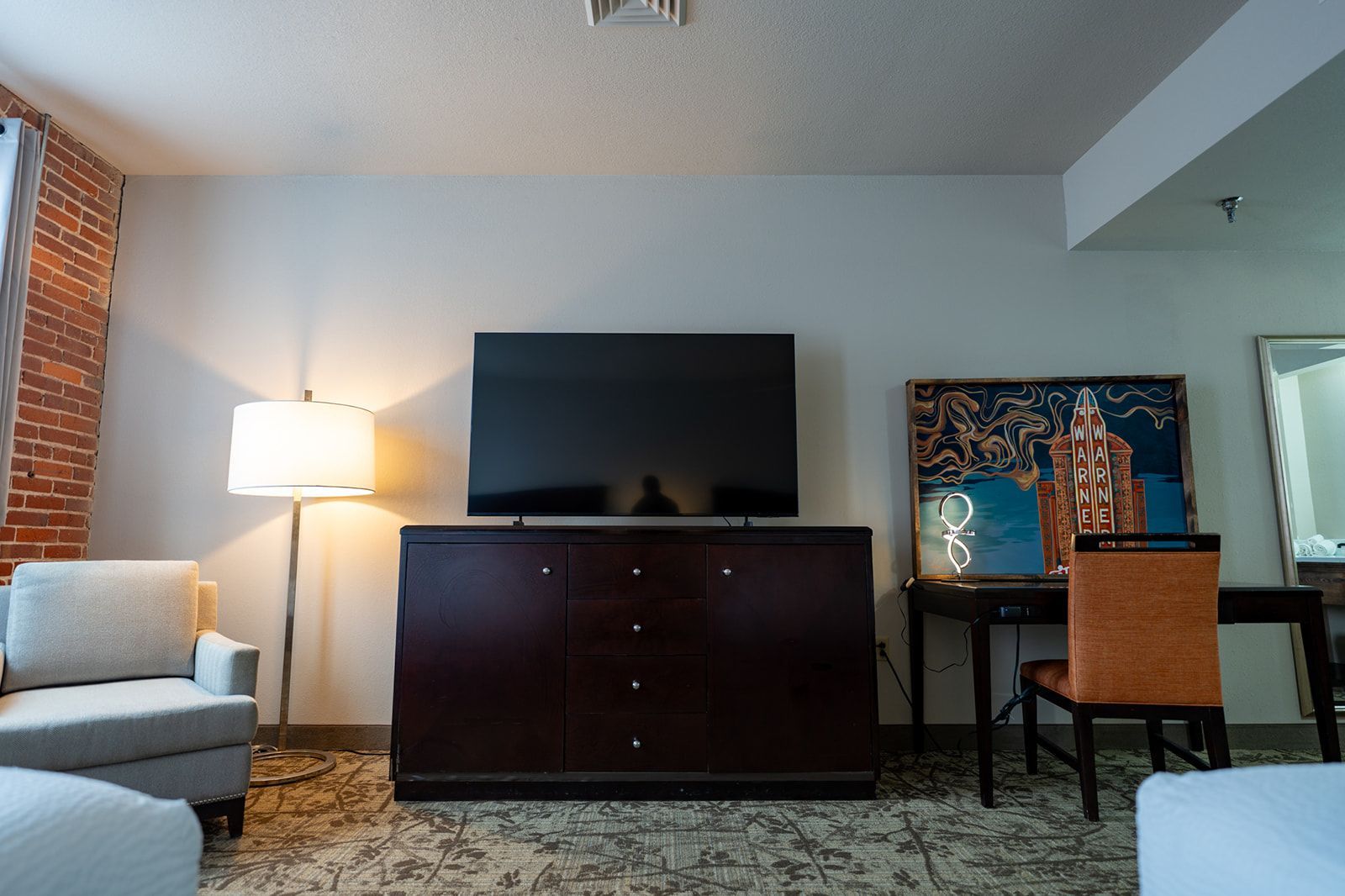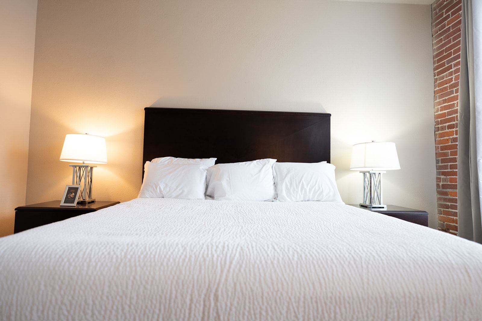 Perfect for families, small groups, or extended stays, our Two-Bedroom Suite features a king bedroom, a queen bedroom, full bathroom, and fully equipped kitchen. Exposed brick, tall ceilings, and large windows create a warm industrial feel, while modern furnishings make it feel like home. Enjoy free Wi-Fi, smart TV, and a spacious living area ideal for relaxing, working, or gathering—all in the heart of downtown Erie.