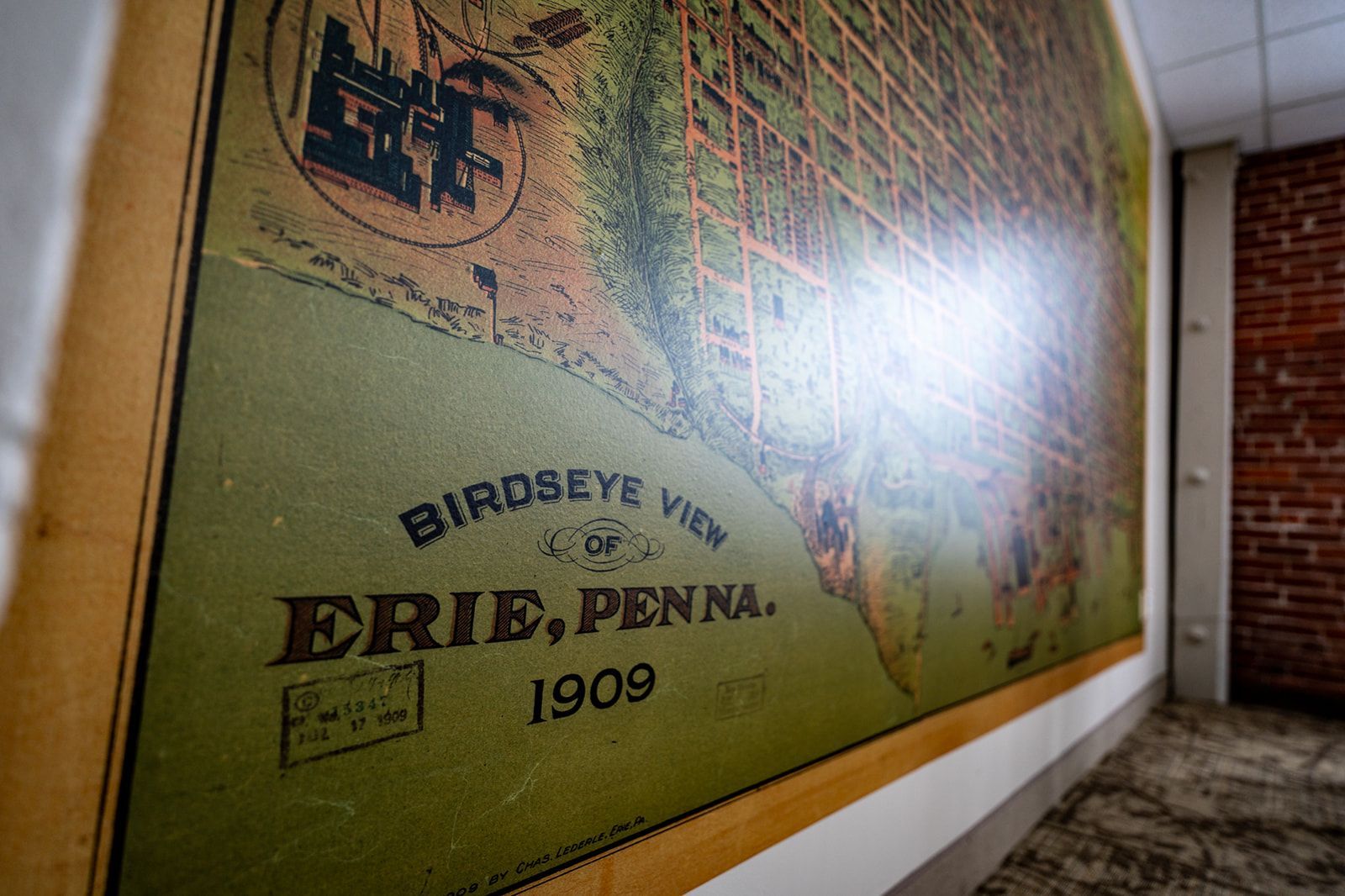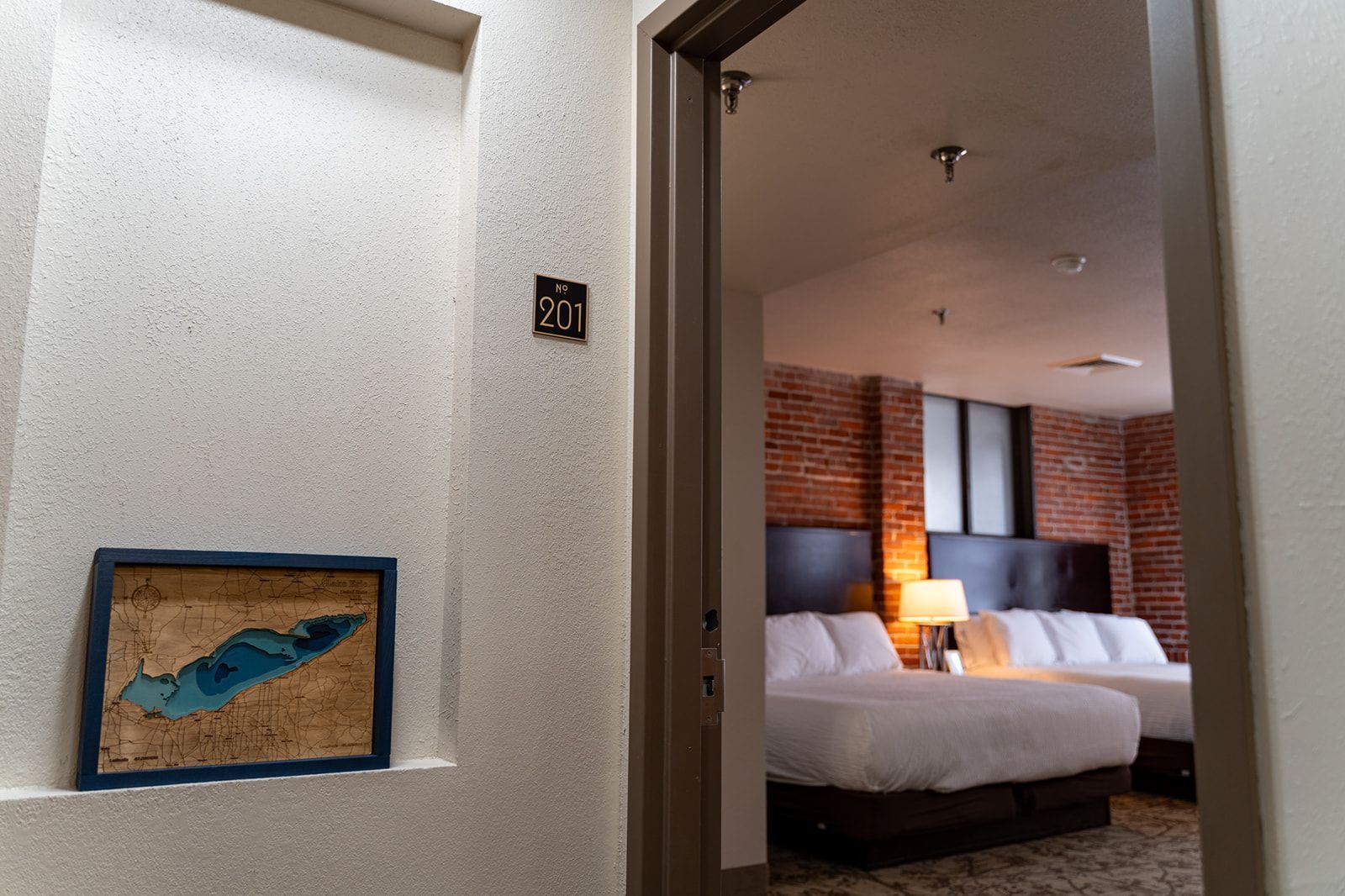 Perfect for families or friends, our Double Bed Room features two cozy double beds, exposed brick, high ceilings, and oversized windows. Enjoy modern comforts like free Wi-Fi, smart TV, mini fridge, workspace, and a Mosaic Tile Bathroom with walk-in shower—all just steps from Erie’s waterfront, dining, and shops.