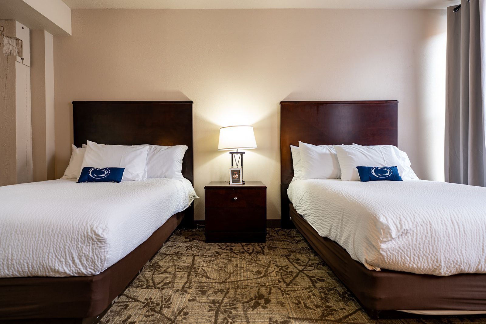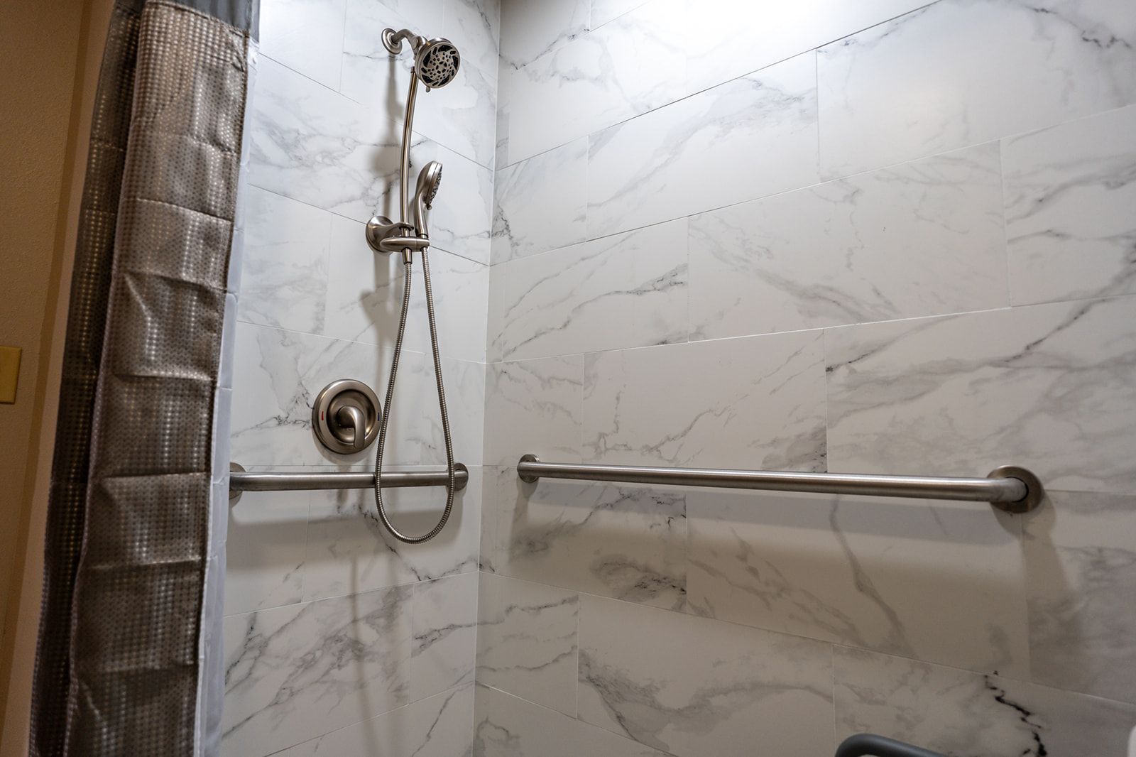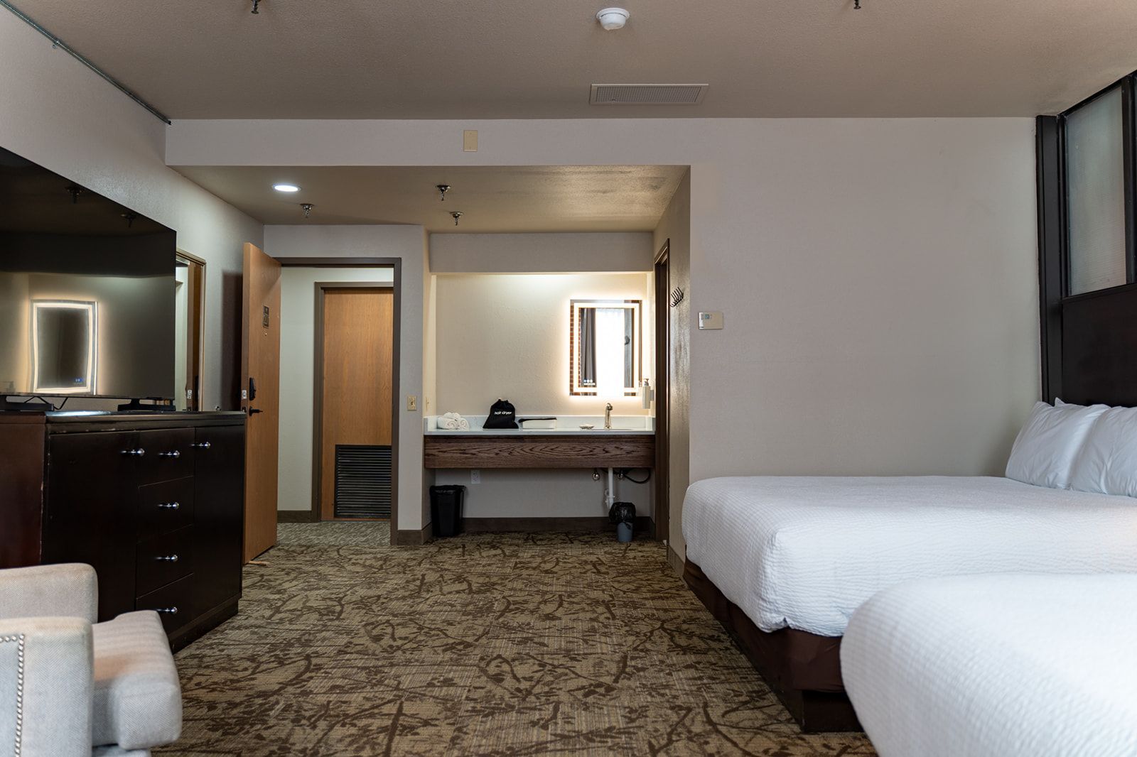 Designed for comfort and accessibility, this room features two plush double beds, wide entryways, lowered fixtures, and an ADA-compliant bathroom with roll-in shower, grab bars, and adjustable showerhead. Large windows, exposed brick, and open space create a bright, welcoming atmosphere. Amenities include free Wi-Fi, smart TV, full-size fridge, and a spacious workstation—perfect for medical visits, events, or getaways in downtown Erie.