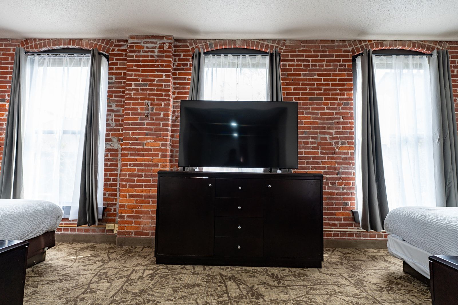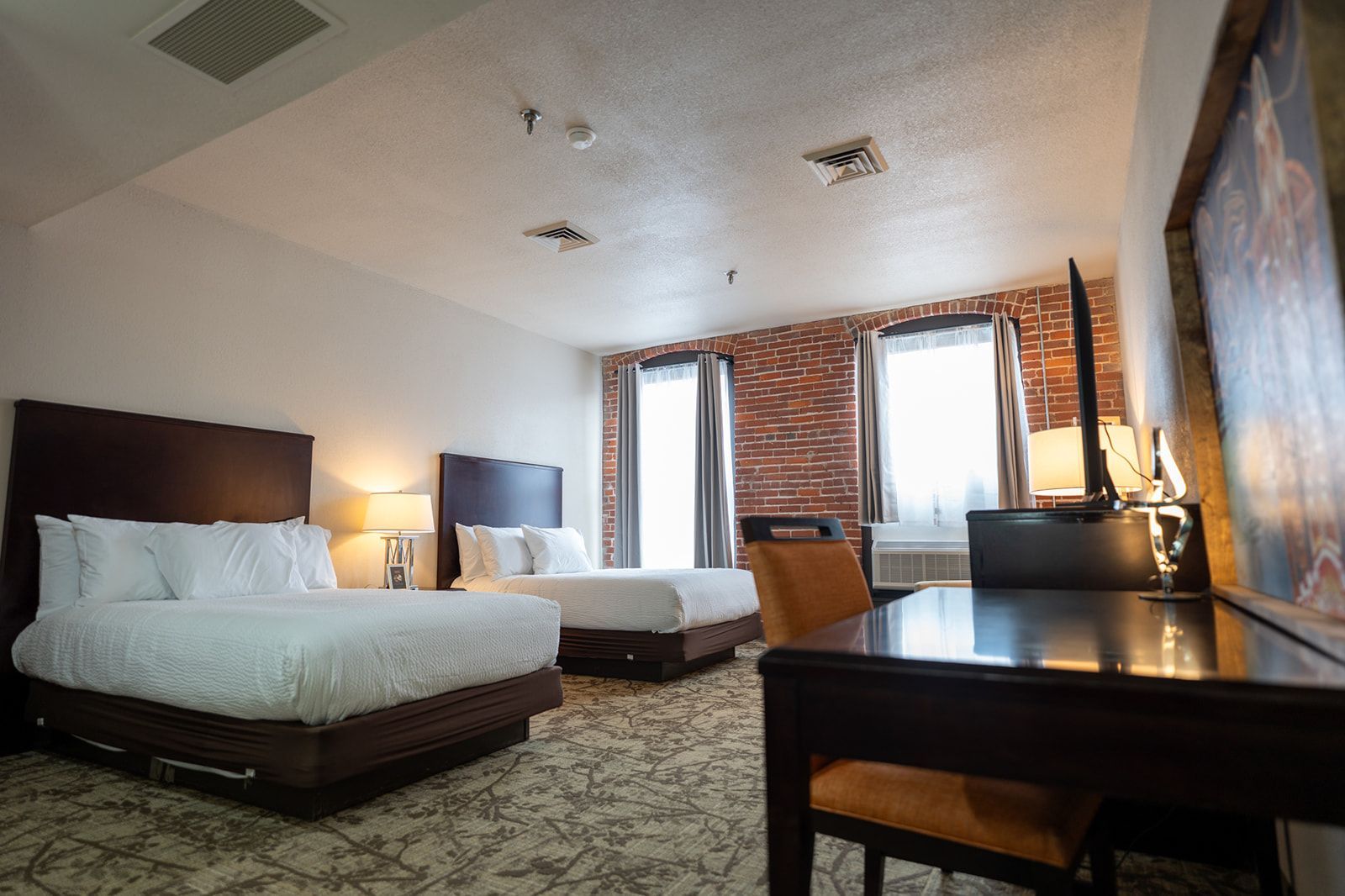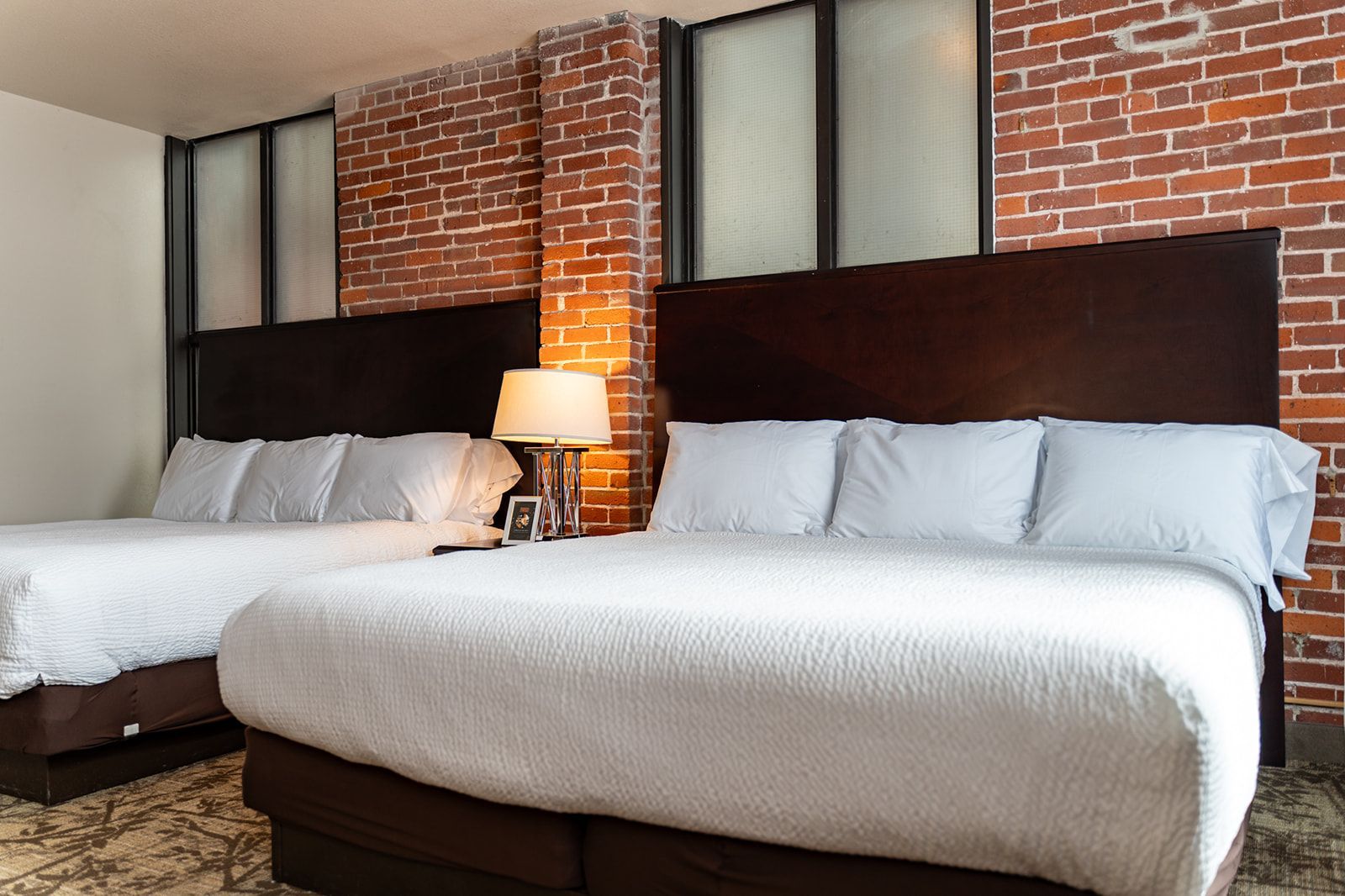 Perfect for groups or families, our Double King Room offers two king beds in an oversized layout with exposed brick, large windows, and modern style. Enjoy a smart TV, high-speed Wi-Fi, mini fridge, workspace, and a mosaic tile bathroom with walk-in shower and premium amenities.