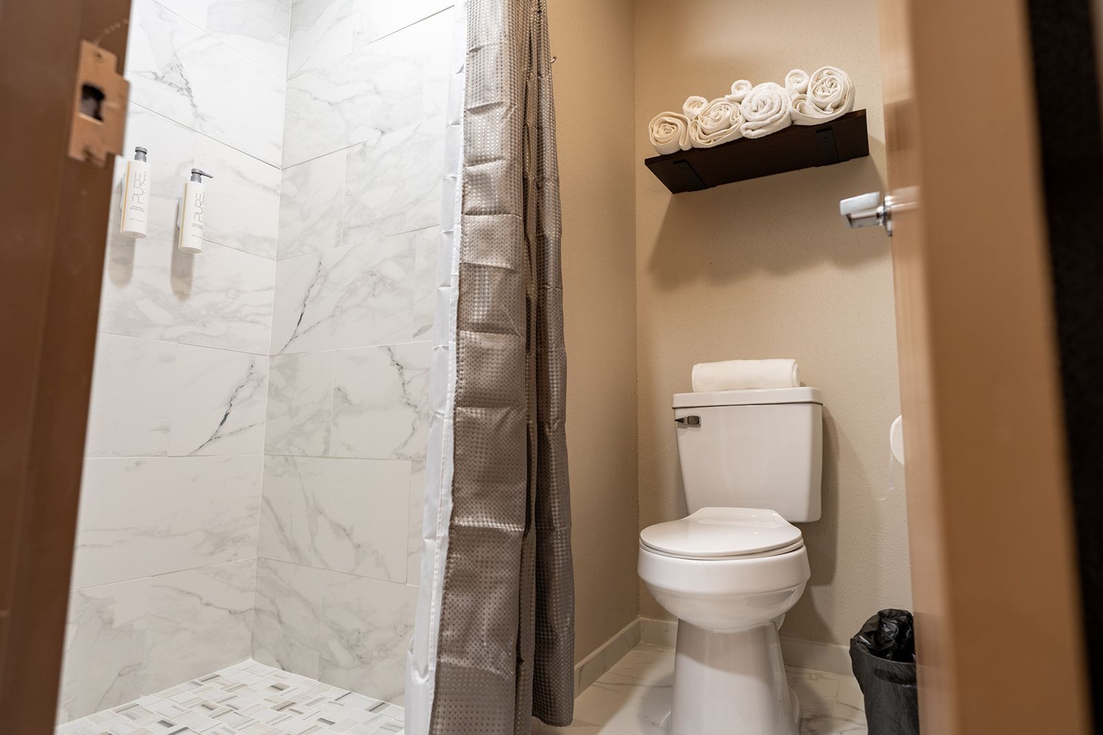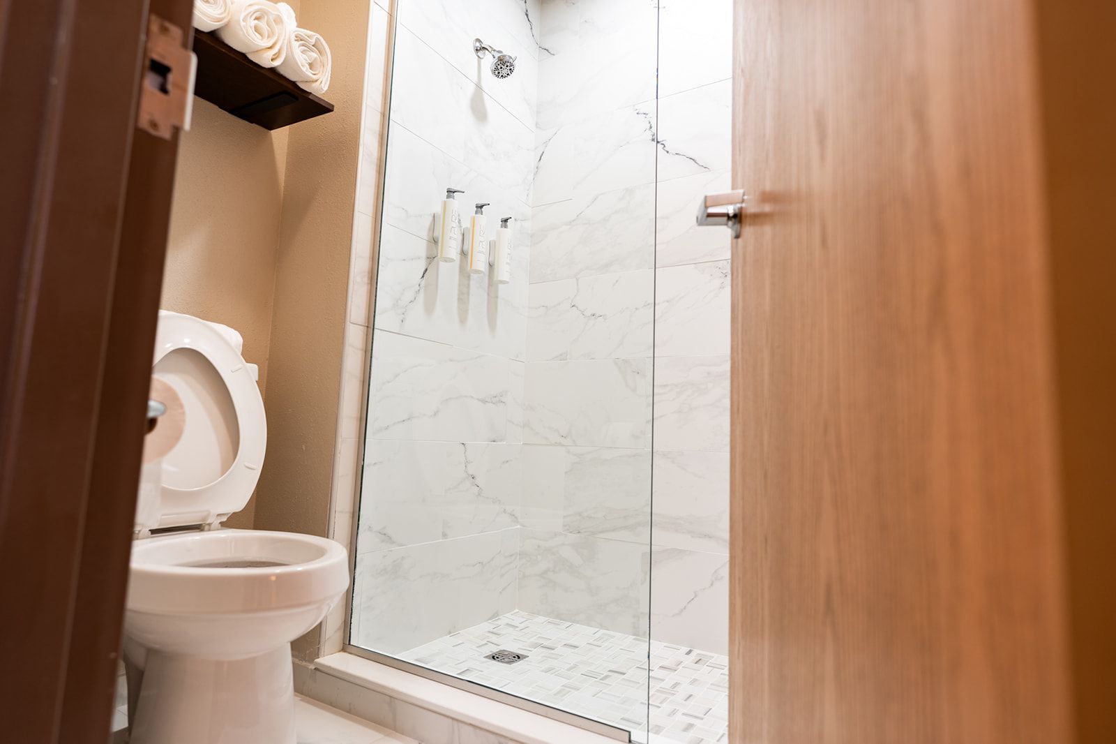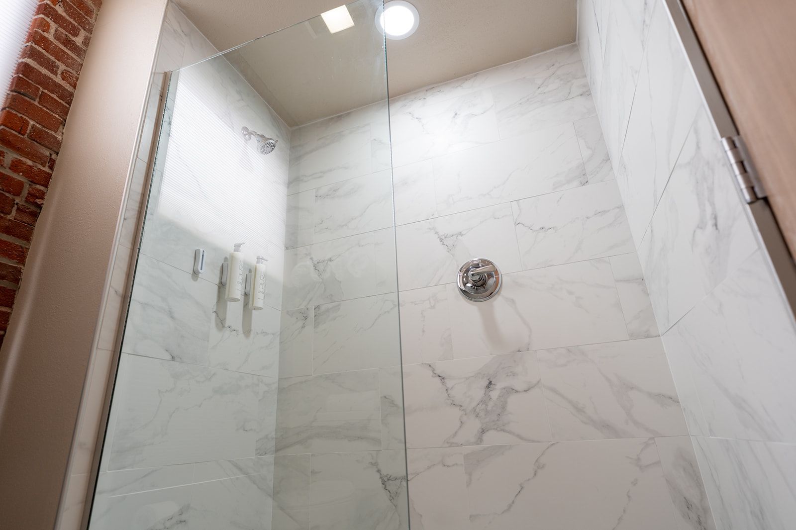 Relax in our spacious Large King Room, featuring high ceilings, exposed brick, and oversized windows. A plush king bed with premium linens, dedicated workspace, smart TV, mini fridge, free Wi-Fi, and a Mosaic Tile Bathroom with walk-in shower make it ideal for both work and leisure. Just steps from Erie’s waterfront, dining, and cultural attractions.