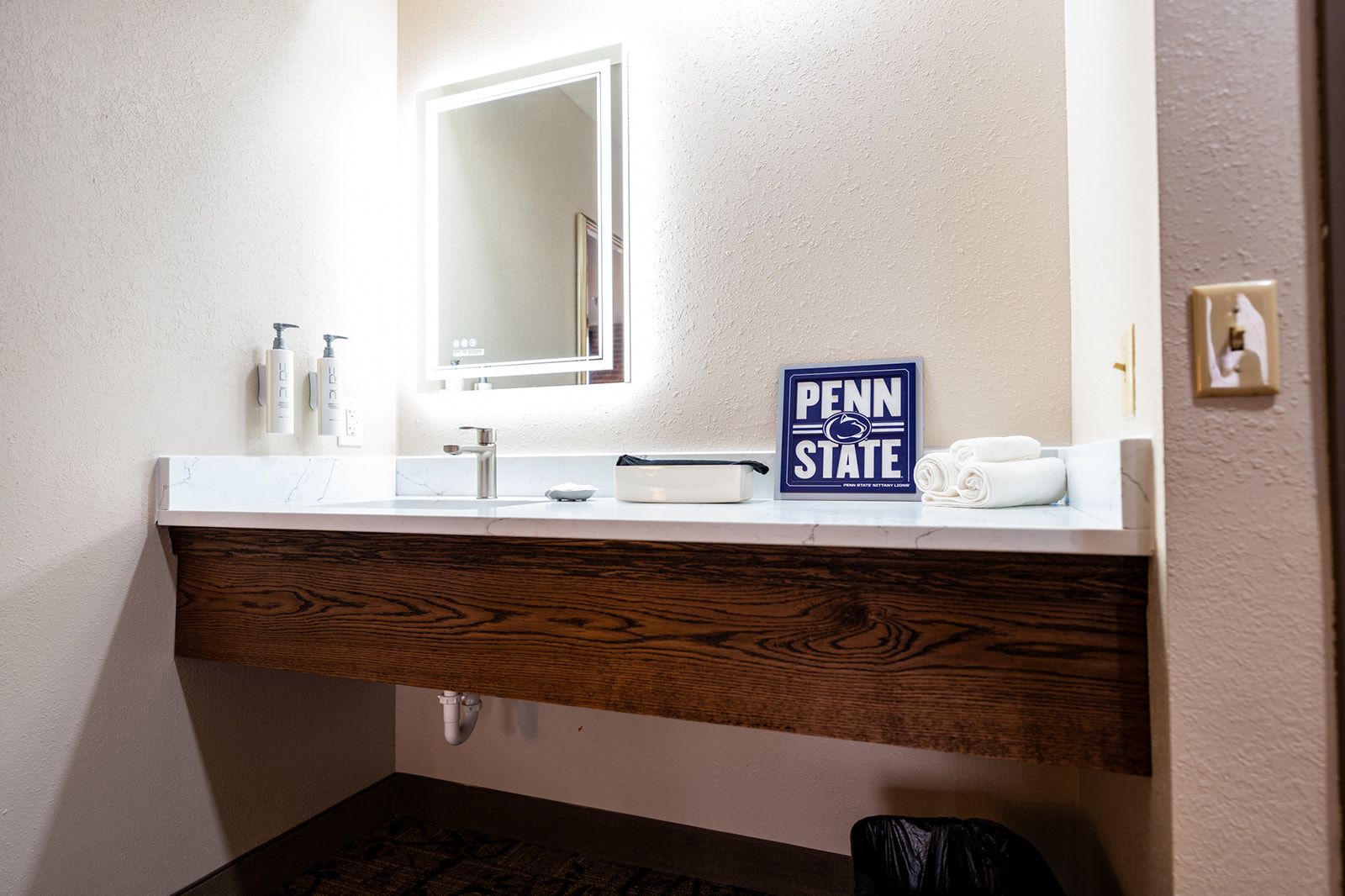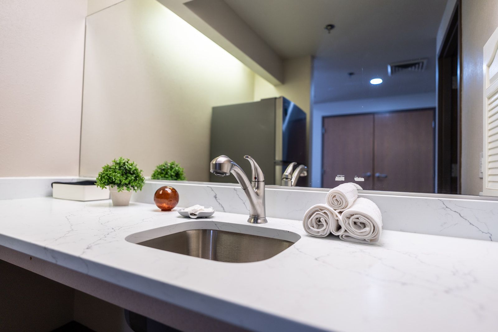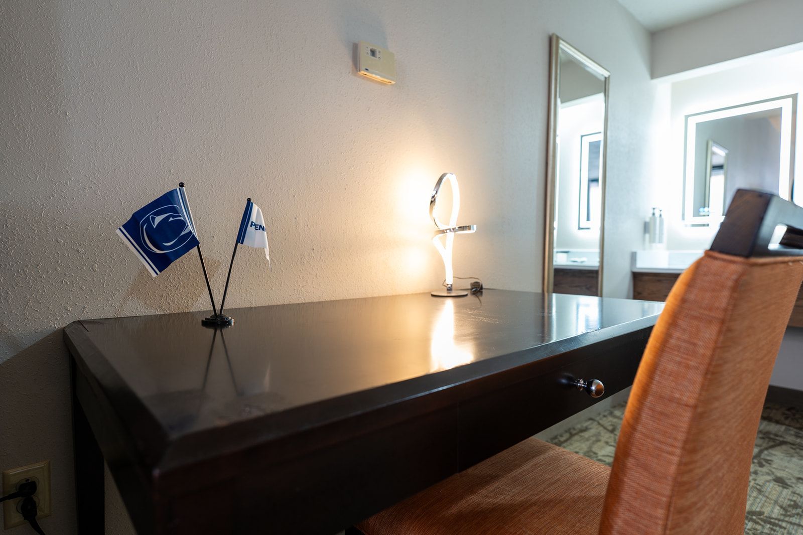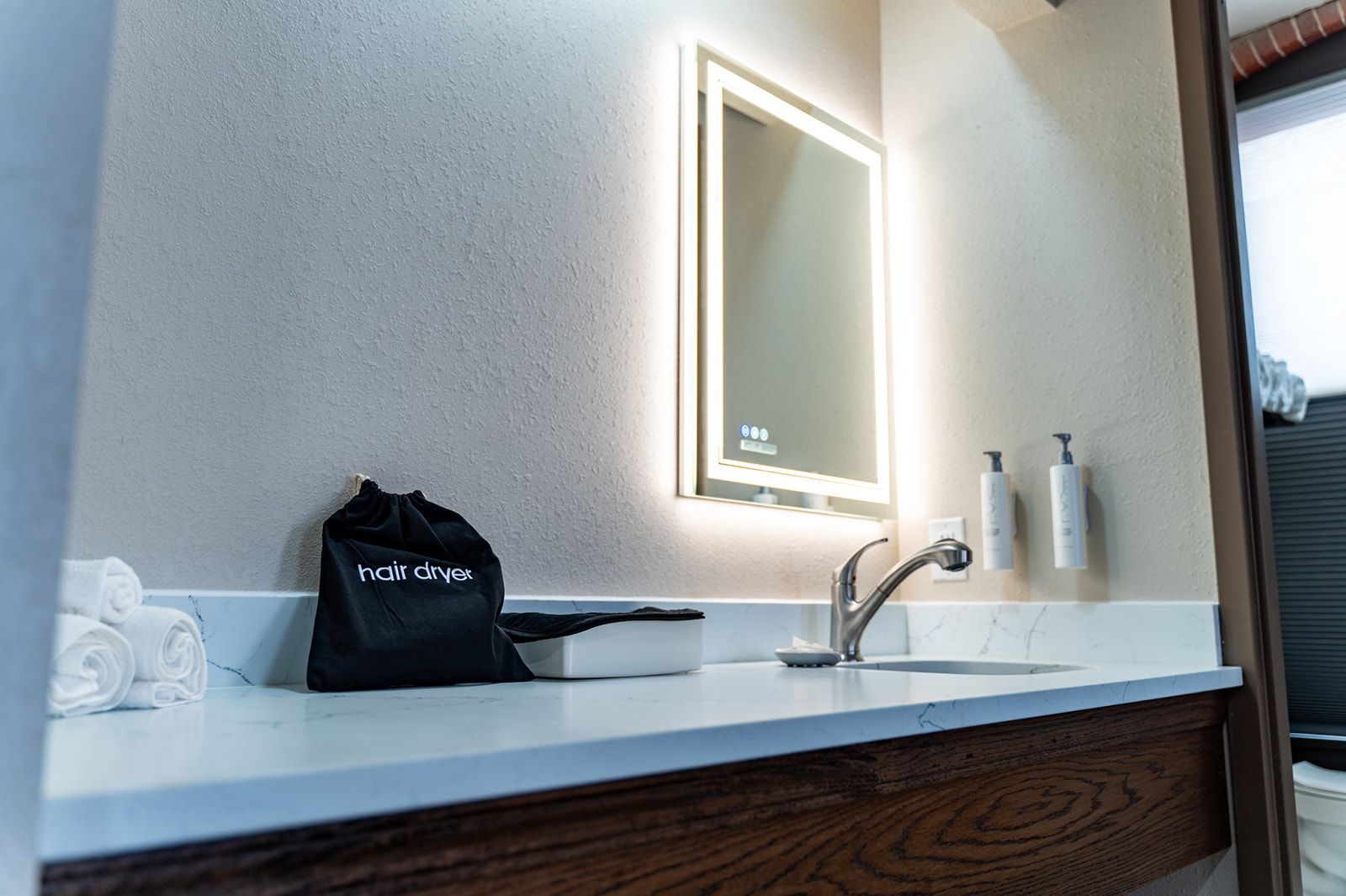 Relax in our spacious Large King Room, featuring high ceilings, exposed brick, and oversized windows. A plush king bed with premium linens, dedicated workspace, smart TV, mini fridge, free Wi-Fi, and a Mosaic Tile Bathroom with walk-in shower make it ideal for both work and leisure. Just steps from Erie’s waterfront, dining, and cultural attractions.