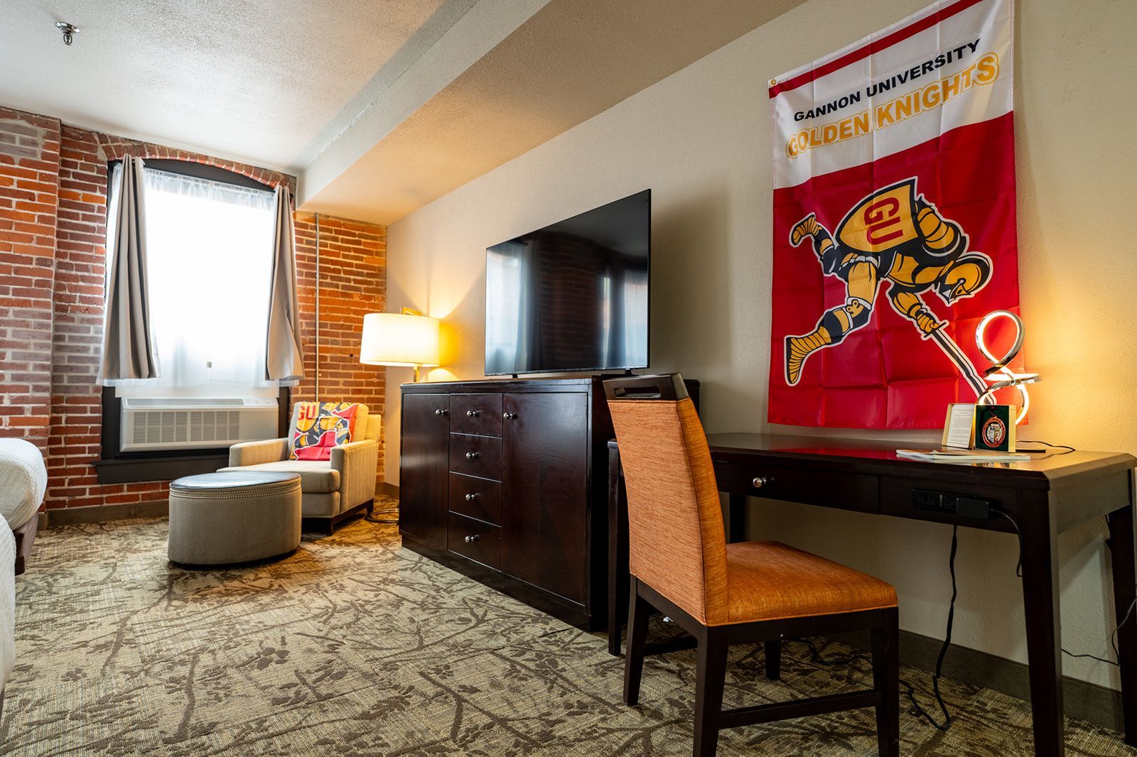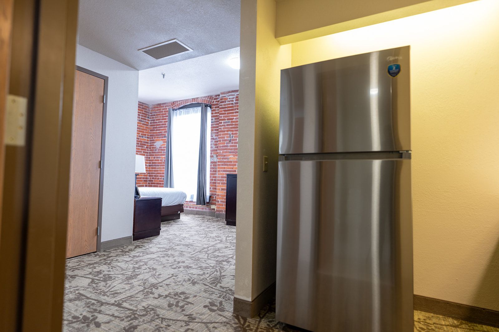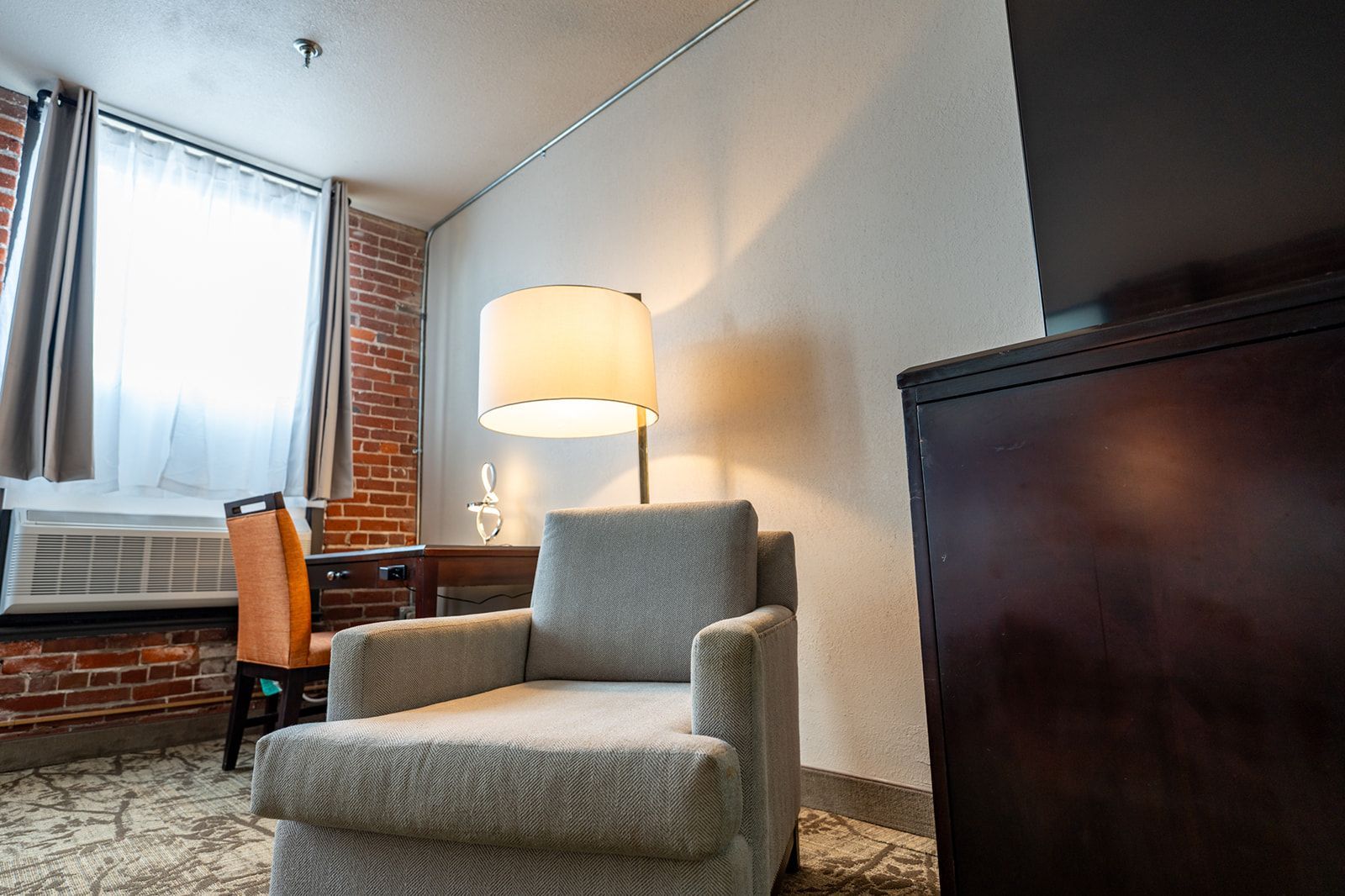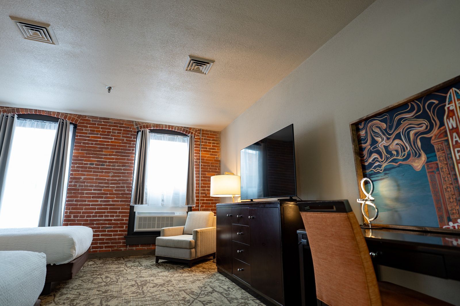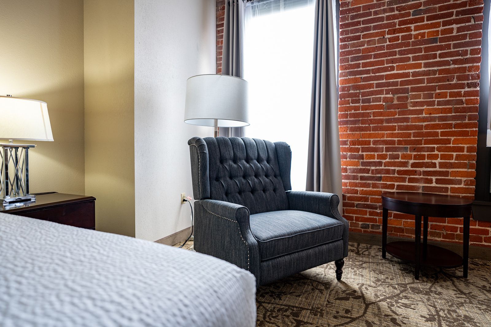 Our King Room with Recliner offers both luxury and flexibility, featuring a plush king-size bed and a full-size upholstered recliner—ideal for added support, recovery, or simply relaxing. Industrial details like exposed brick and large windows bring character and natural light, while modern amenities include free Wi-Fi, smart TV, mini fridge, and a dedicated work surface. A Mosaic Tile Bathroom with walk-in shower and plush towels completes this comfort-focused retreat, just minutes from Erie’s hospitals, shops, and waterfront.